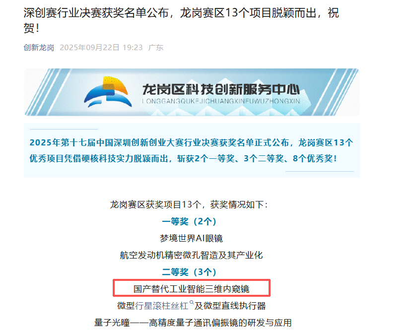 近日,第十七届中国深圳创新创业大赛总决赛圆满落幕,赛场传来振奋人心的喜讯!深圳亚泰光技术有限公司凭借其自主研发的“国产替代工业智能三维内窥镜”项目,在众多顶尖科创项目中一路过关斩将,最终勇夺大赛亚军,荣获二等奖的优异成绩!这一荣誉不仅是对亚泰光技术实力的权威认证,更标志着我国在高端工业无损检测装备领域实现重要突破。