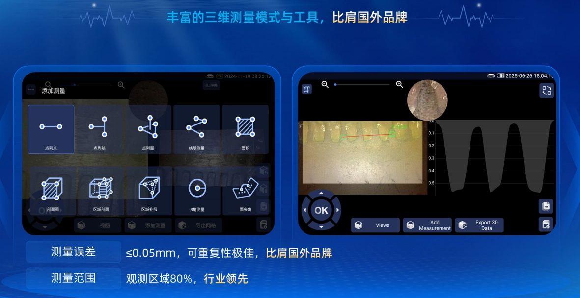 丰富测量工具,精度达0.01mm:提供10种测量模式,观测区域≥80%,支持实时测距等,满足高精度工业检测需求。